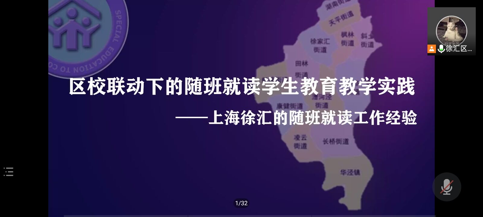 特殊教育系举办了关于“区校联动下的随班就读学生教育教学实践”的线上主题讲座。本次讲座邀请到上海市徐汇区特教指导中心的程硕老师为主讲人,特殊教育系安文军老师担任此次讲座主持。参与此次讲座的有特殊教育系全体教师与2018级、2019级特殊教育专业学生。