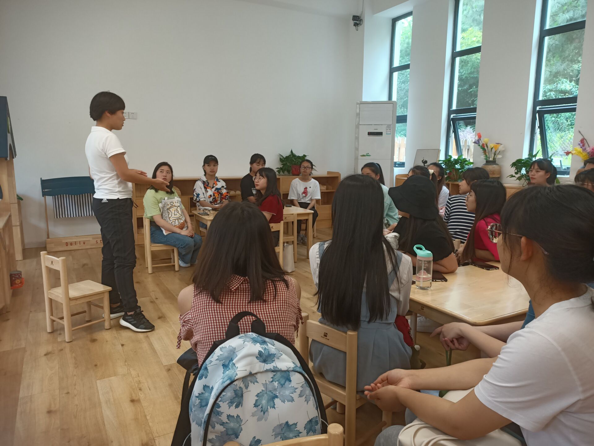 首先,幼儿园的张园长带领大家参观幼儿园,参观从幼儿园的户外环境开始。幸福学堂幼儿园位于双龙生态公园里,虽然幼儿园有一个围栏,但是张园长说在开展户外探索活动时,可以随时突破围栏,让孩子们有更广泛的空间去接触大自然,在自然中去探索,在自然中获得发展。紧接着开始参观幼儿园室内环境,进入室内,首先看见的是三个班的幼儿的书包、水杯及其他物品的放置处,干净整洁。幼儿园只有三个班级,每个班级10-15名幼儿,混龄教育,每个班两位老师,班级没有固定的教室,教师与幼儿之间的相处像家人一样,是平等尊重的关系。在教学模式上,张园长介绍,他们遵循的是自由、开放、平等、共同进步的教育理念,教育中鼓励幼儿发现自己、做自己、挖掘自己的潜力。教师可以在教育计划的基础上,根据幼儿需要和兴趣开展随机教学。在制定教育计划时会参考《3-6岁儿童学习发展指南》,也会开放实施五大领域的课程,在每个月月底时还会开展全园的活动。参观结束后,张园长让小班的薛老师和中班的毛老师与同学们进行了分享和交流。