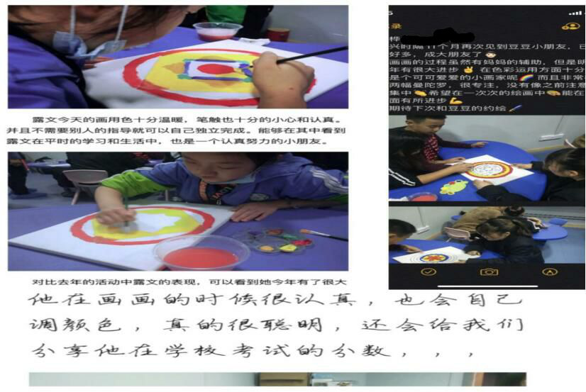 早上8点社团成员从学校出发前往聚爱之城特殊机构,到达目的地后,大家就迅速的投入到工作之中,协助小朋友们的家长以及工作人员一起用曼陀罗涂鸦绘画陪伴这些小朋友,活动完成之后,小伙伴们都用手机便签将自己在这次艺术疗愈活动后的感想与小朋友们的表现记录下来并分享给这些小朋友的家长。