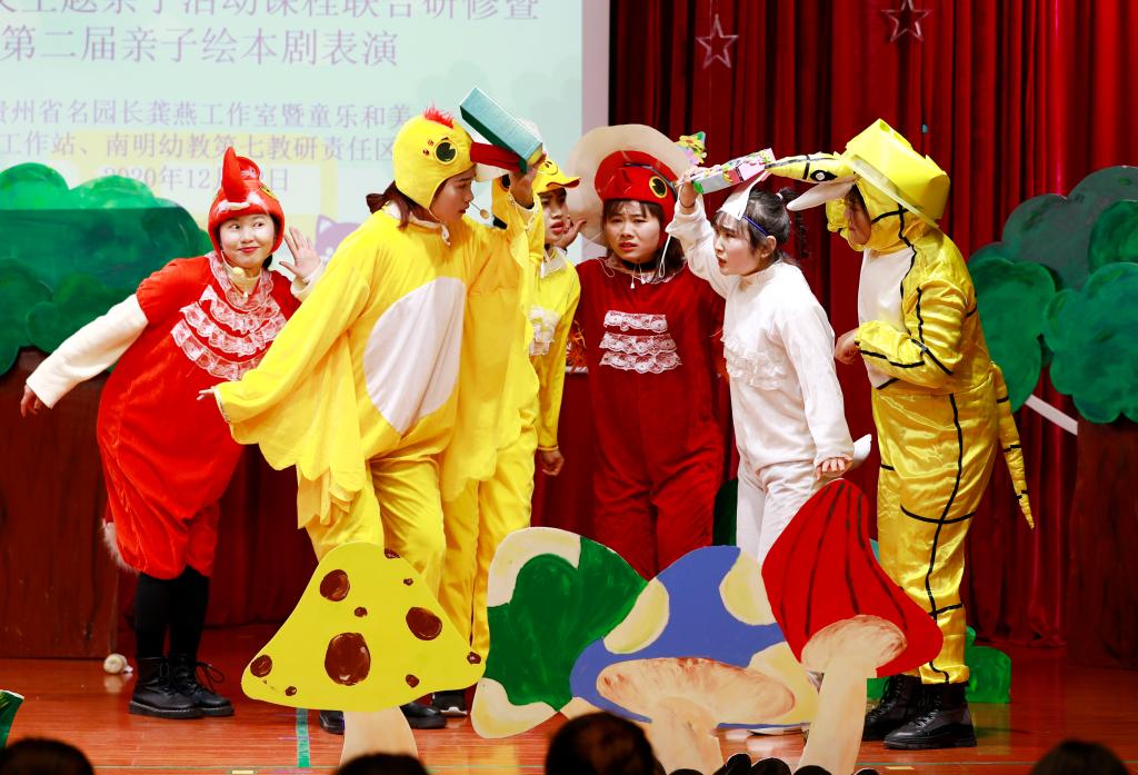 九点三十分,绘本表演正式拉开帷幕,首先,由主持人介绍本次参会嘉宾;其次,13个绘本表演依次进行,分别有贵阳市第十幼儿园的幼儿与教师带来的十一个表演和贵州师范学院学生的两个绘本剧表演;我院学前教育学生在绘本表演《小鸡潘妮》、《狐狸爸爸鸭儿子》中获得了观看人员的一致好评。最后,由冯静老师发言,对绘本表演的主要做法进行了经验交流。