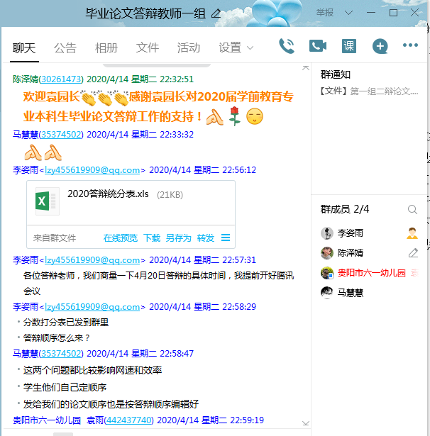 由于受疫情影响,今年的毕业论文答辩形式较为特殊,采取网络在线答辩的方式进行,全体成员都是第一次组织在线论文答辩工作,缺乏经验,因此立马创建“毕业论文答辩教师一组”QQ群,商讨答辩事宜。