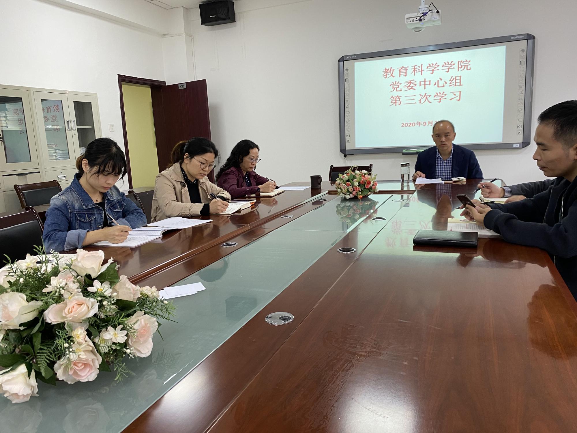 2020年党委中心组第三次集中学习在逸夫楼321会议室进行。院党委书记彭祥友、院长刘红、副书记傅小芳、副院长黎平辉和袁川,以及团委、各党支部负责人到场参加。学习活动由彭祥友主持。