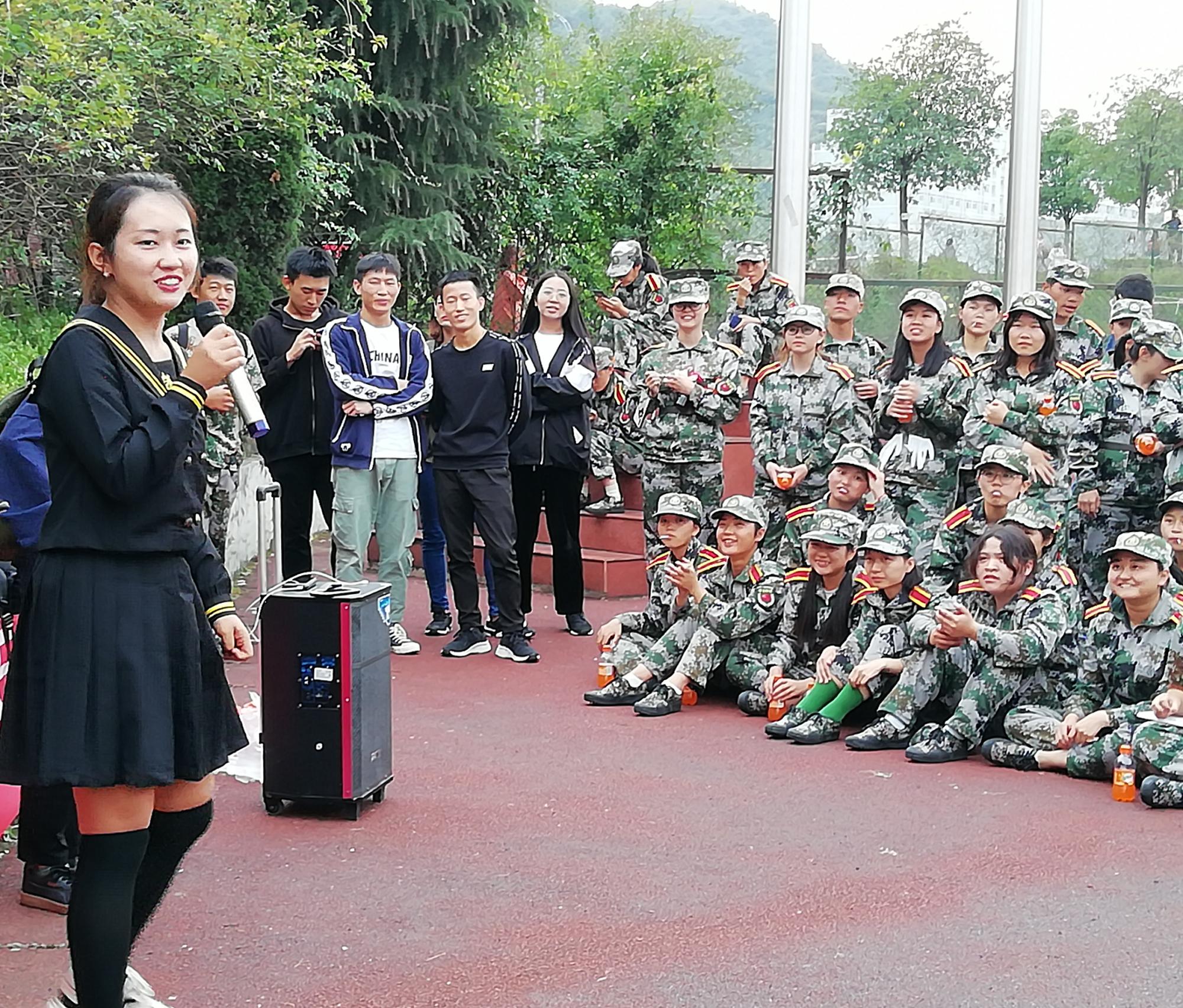 的军训新生,活动前准备了饮品与糖果,在国旗台的一隅,热闹的欢呼声不时响起,大家有的并排坐在一起,有的站着,有的蹲着,围成一圈,在学生会的同学把小礼物发放完毕之后,紧接而来的是之前精心准备的节目个人独唱,由此开始,活动开始逐步进入高潮。