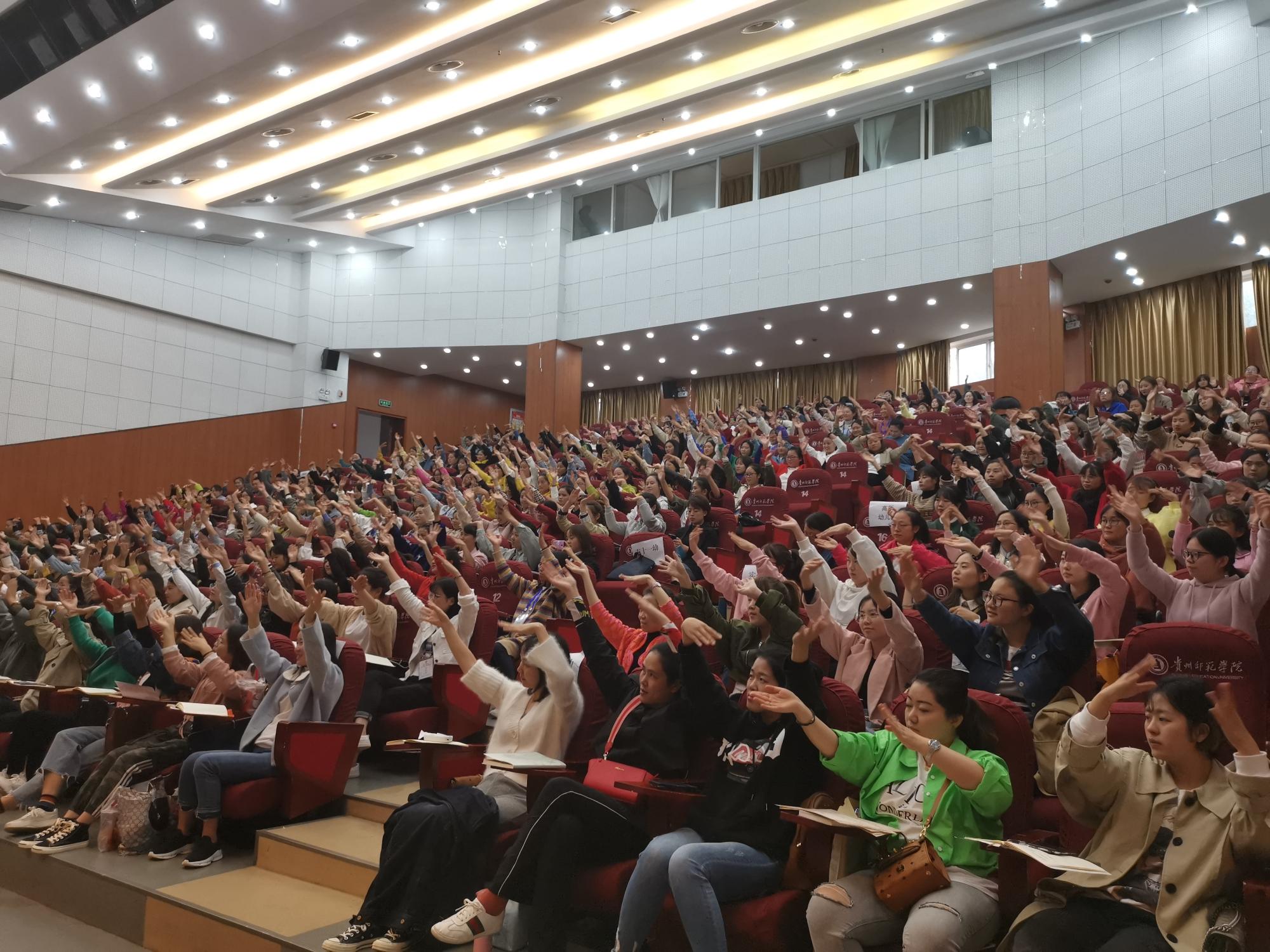 10月14日,专家耿涛老师在逸夫楼演播厅为我院国培新任教师二期培训班196名学员开展《幼儿园音乐游戏化教学》讲座,参与本次讲座的还有我院基地幼儿园的老师,分别为贵阳市第三实验幼儿园、贵阳市第二实验幼儿园、北海幼儿园、乌当区幼儿园、息烽小寨坝幼儿园、西山幼儿园、实验幼儿园等共计80名教师以及贵阳市教科所网络抢票平台中获取参训名额的100名教师。
