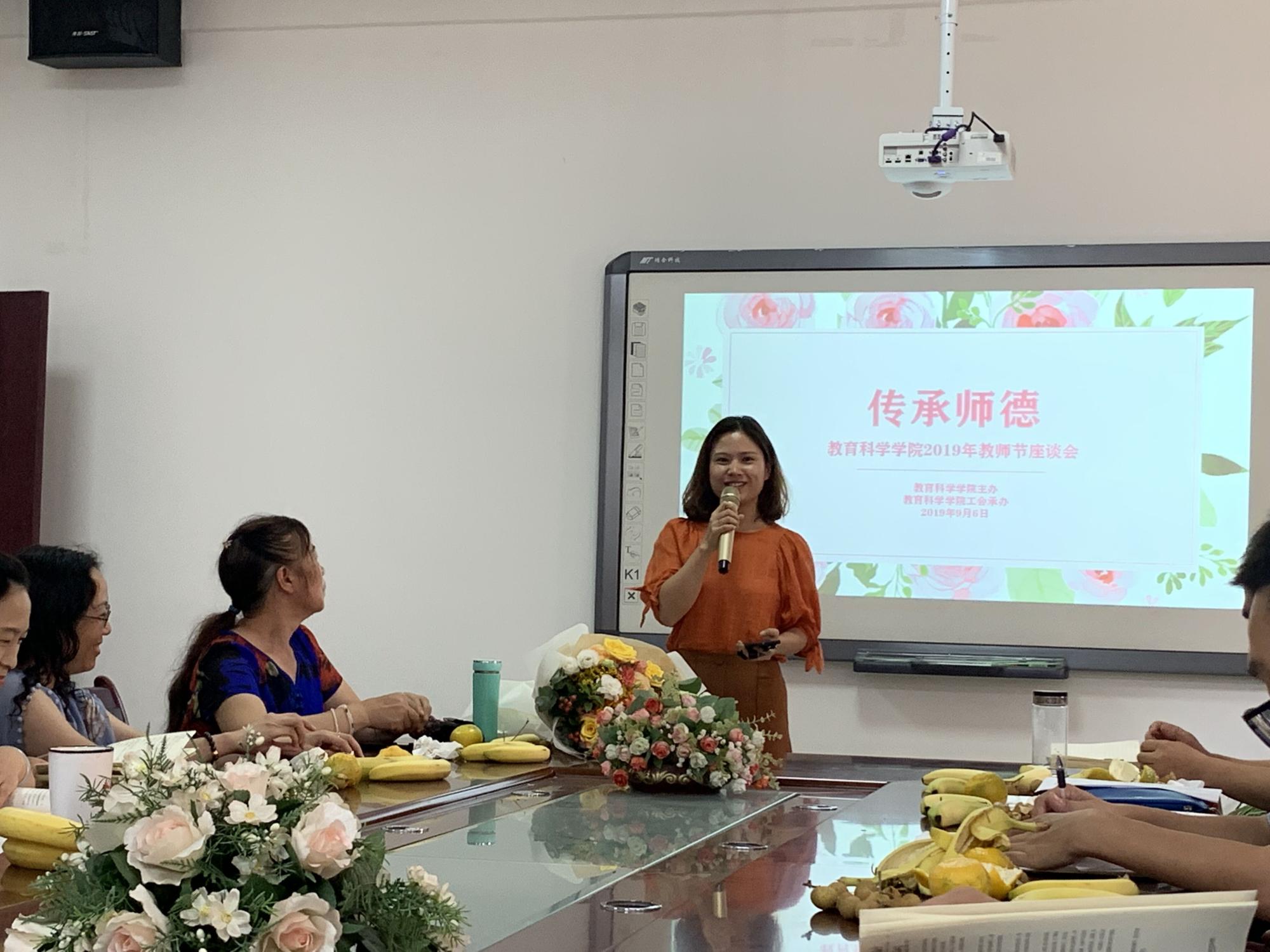 在青年教师朱紫桥《天佑中华》动人的歌声中,本次座谈会拉开了帷幕。首先,刘红代表学院致辞,对全体教师表示节日的问候和衷心的感谢;接着,刘启艳现场分享教书育人的感受,对我院年轻教师给予深切寄语,并深情朗诵《我骄傲,我是一名教师》;其次,成人色情