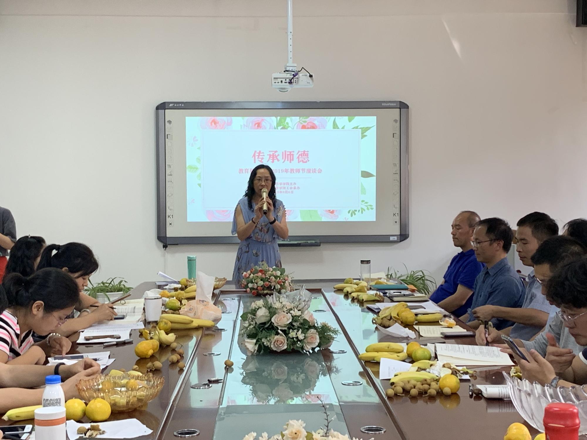 主办、学院工会承办的“传承师德”2019年教师节座谈会在逸夫楼3楼会议室举行。院党委书记彭祥友、院长刘红、副书记傅小芳、副院长黎平辉、副院长袁川出席座谈会,退休教师代表刘启艳教授及全院教师到场参加。座谈会由院工会主席主懿芹主持。