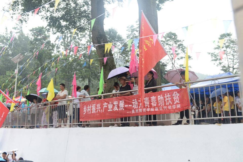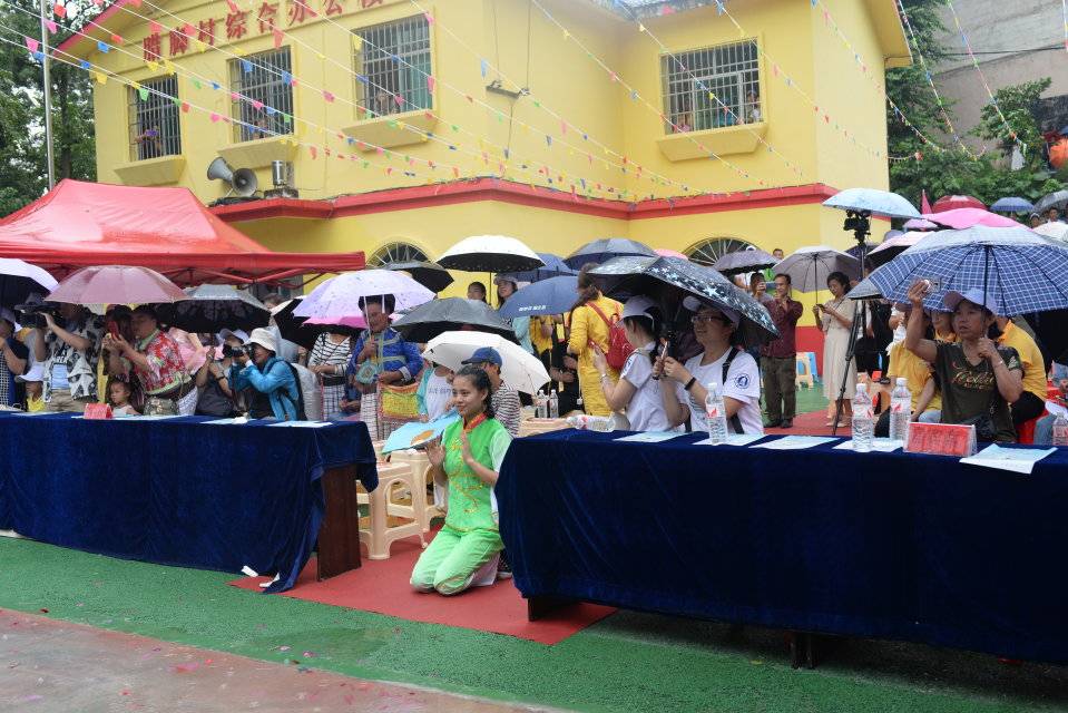 师生们组织龙窝村的小朋友有序前往腊脚村进行文艺汇演,一声惊雷拉开了文艺汇演的序幕,由于暴雨突袭,在稍作休息之后文艺汇演继续开始。