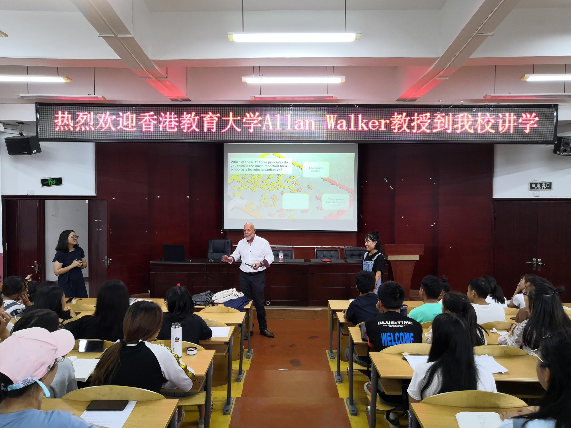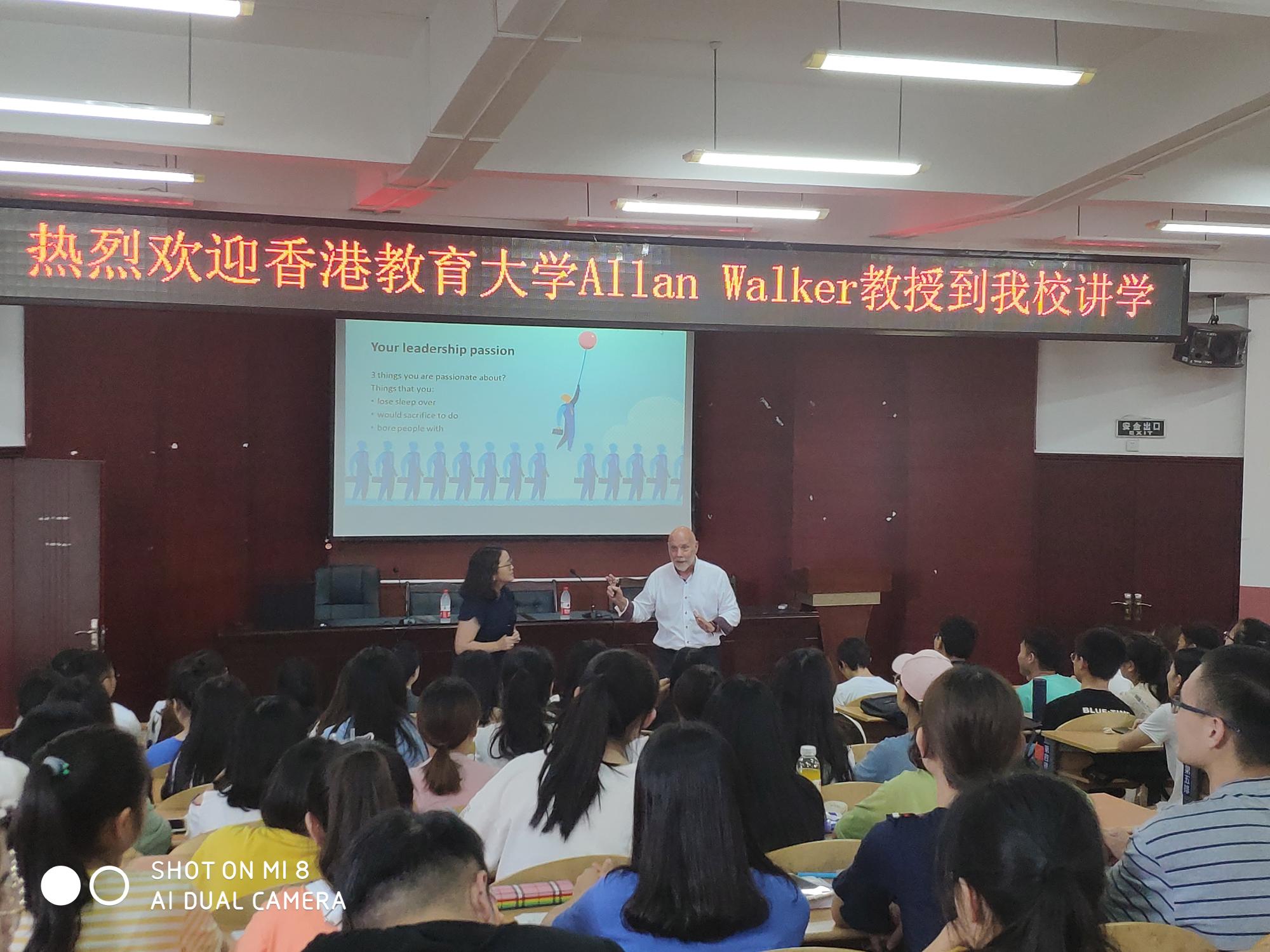 全体学生干部及部分教师代表开讲。Alan Walker教授让同学们以想象自己是一个领导,自己最有激情去做的的事情是什么?你最尊敬的领导是谁,你希望自己在别人眼中是一个什么样的领导等三个问题,将学生干部们带入角色进行思考,并与现场学生干部进行现场互动和交流。接着Alan Walker教授为大家描述了未来学校发展的前景,并带领同学们一起学习和思考了领导未来学校的7个原则,包括面向未来的领导,基于证据和产出、能够做事、能够打开新的视野等。