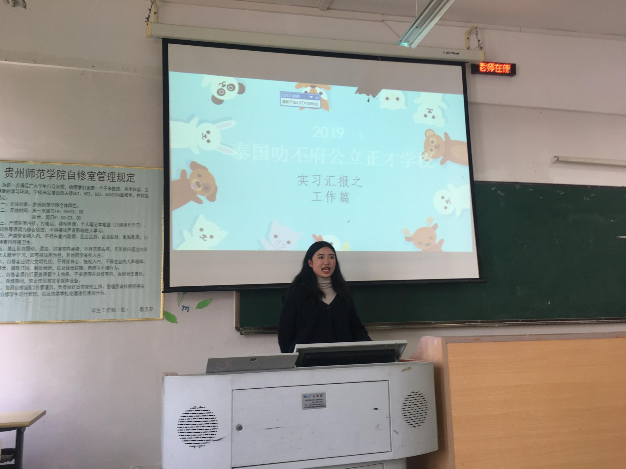 会上,八名从泰国实习归来的学生用她们的亲身经历、所感所获为大家呈现了一场精彩的实习汇报分享。她们分别从自己所在学校的概况、办学特色、文化信仰、当地人文景观出发,向大家展现了不同教育制度、不同文化的碰撞,以及丰富、多彩的实习生活。