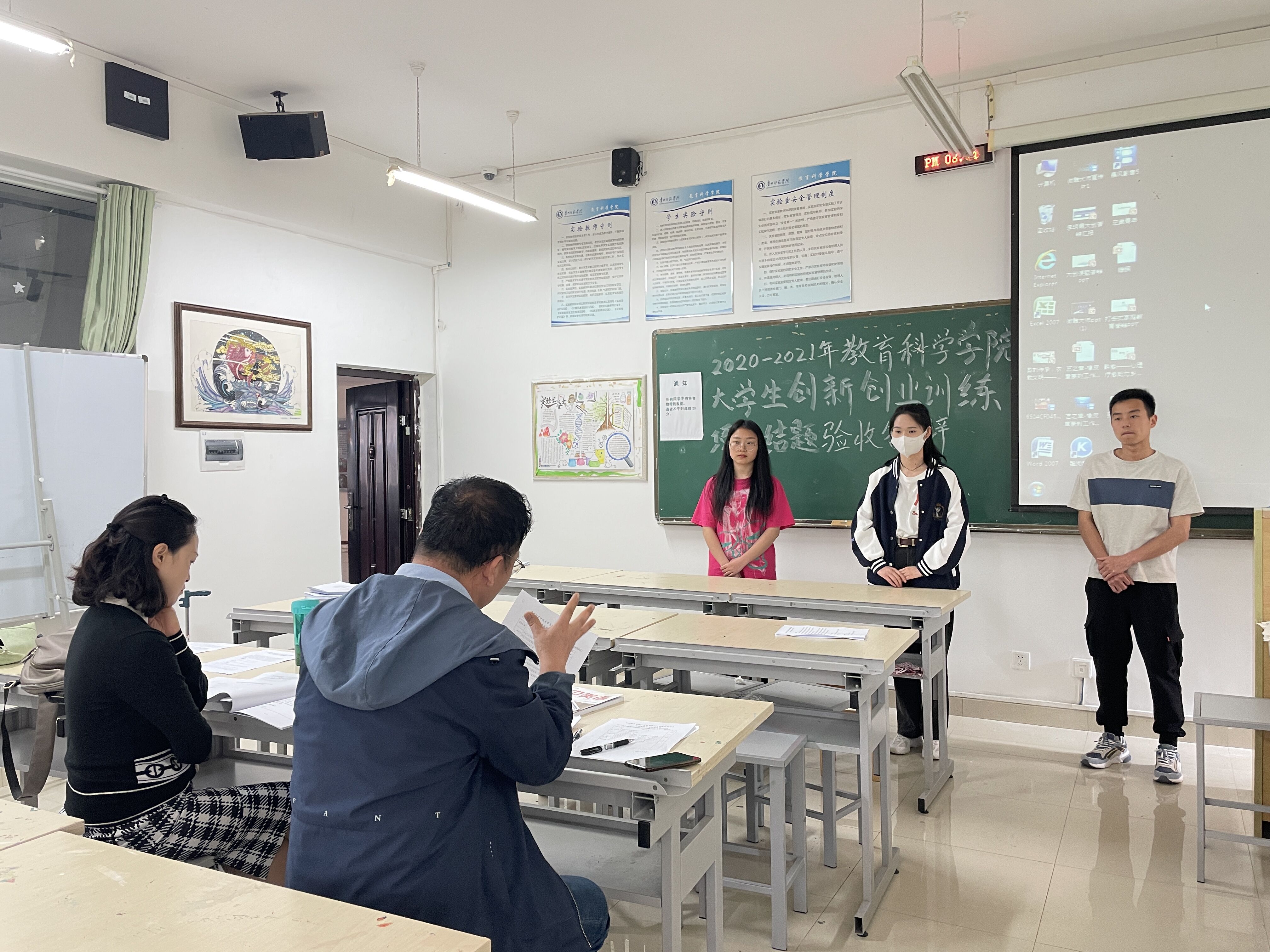 此次参与答辩的项目组共有十支,由郑玉莲、张金勇、刘婧、游超颖四位专业教师对他们的研究成果进行验收答辩,郑玉莲老师任组长,申利丽老师在答辩前强调答辩规则、细节,以确保验收答辩顺利进行,两位2019级艺术教育班的同学作为验收答辩现场助理。