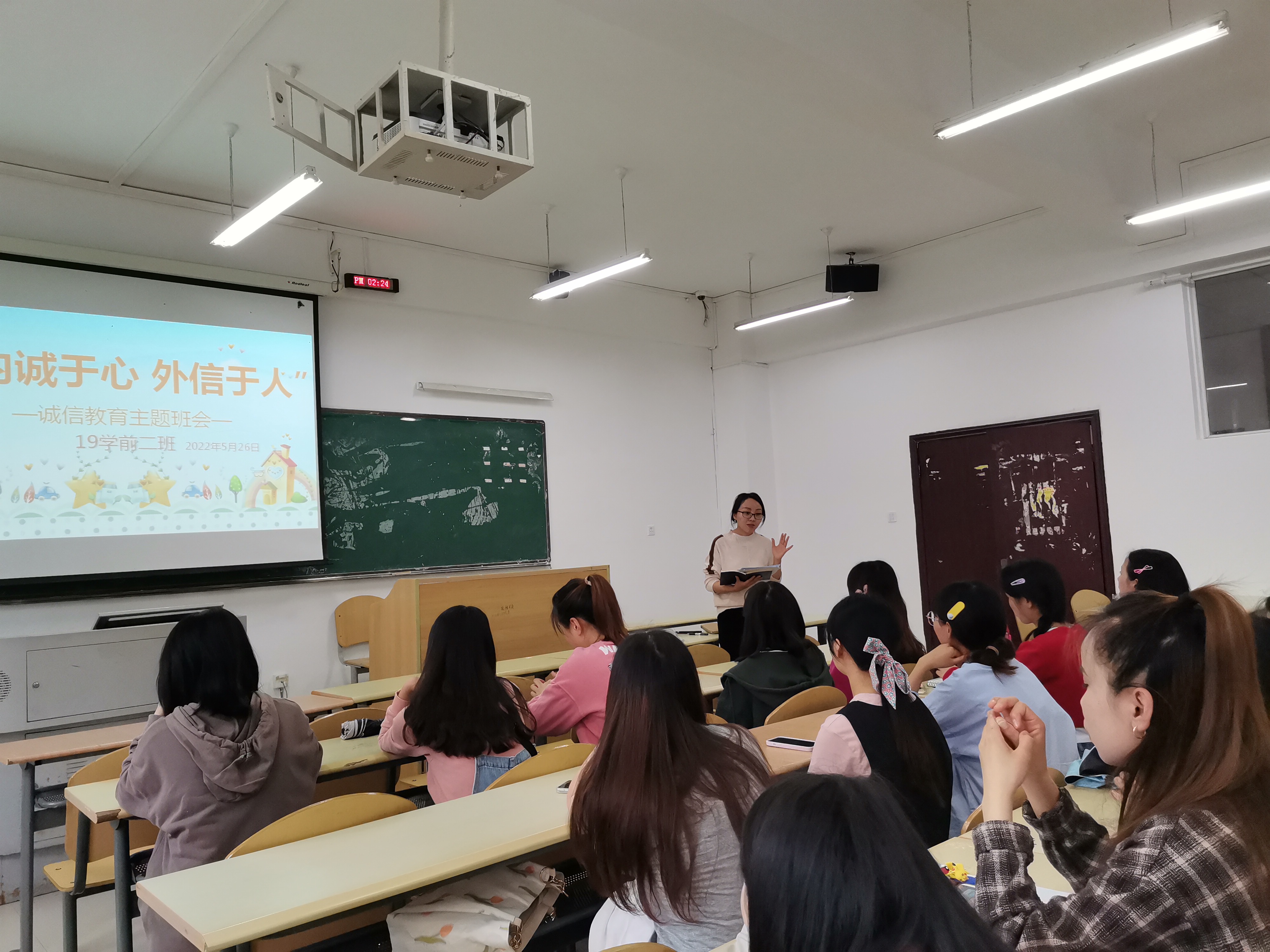 2019级学前教育二班在逸夫楼303教室开展以“内诚于心,外信于人”诚信教育主题班会。会议由班长王利蓝主持,辅导员游超颖参加会议。