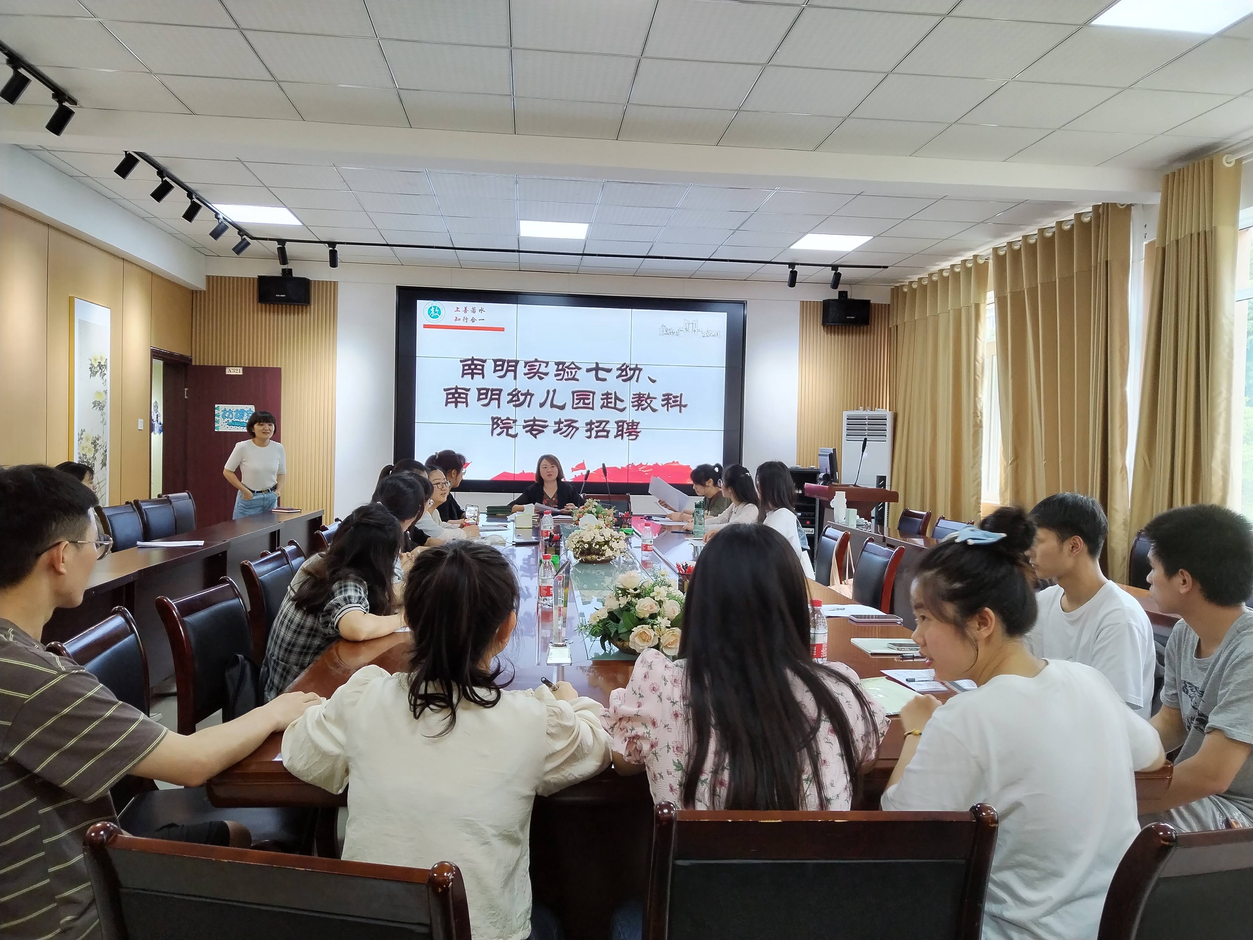 6月2日下午,南明幼儿园、南明区第七幼儿园在逸夫楼321会议室举行2022届毕业生专场招聘会。南明幼儿园人事干部甘悦老师、南明区第七幼儿园办公室主管谢林林老师进行了就业宣讲。学院对接招就处的辅导员鲁蓓蓓老师、2018级学前教育毕业生、部分学前教育专业在校生参加了此次宣讲会。招聘会由鲁蓓蓓主持。此次招聘会采取线上线下相结合的方式进行。