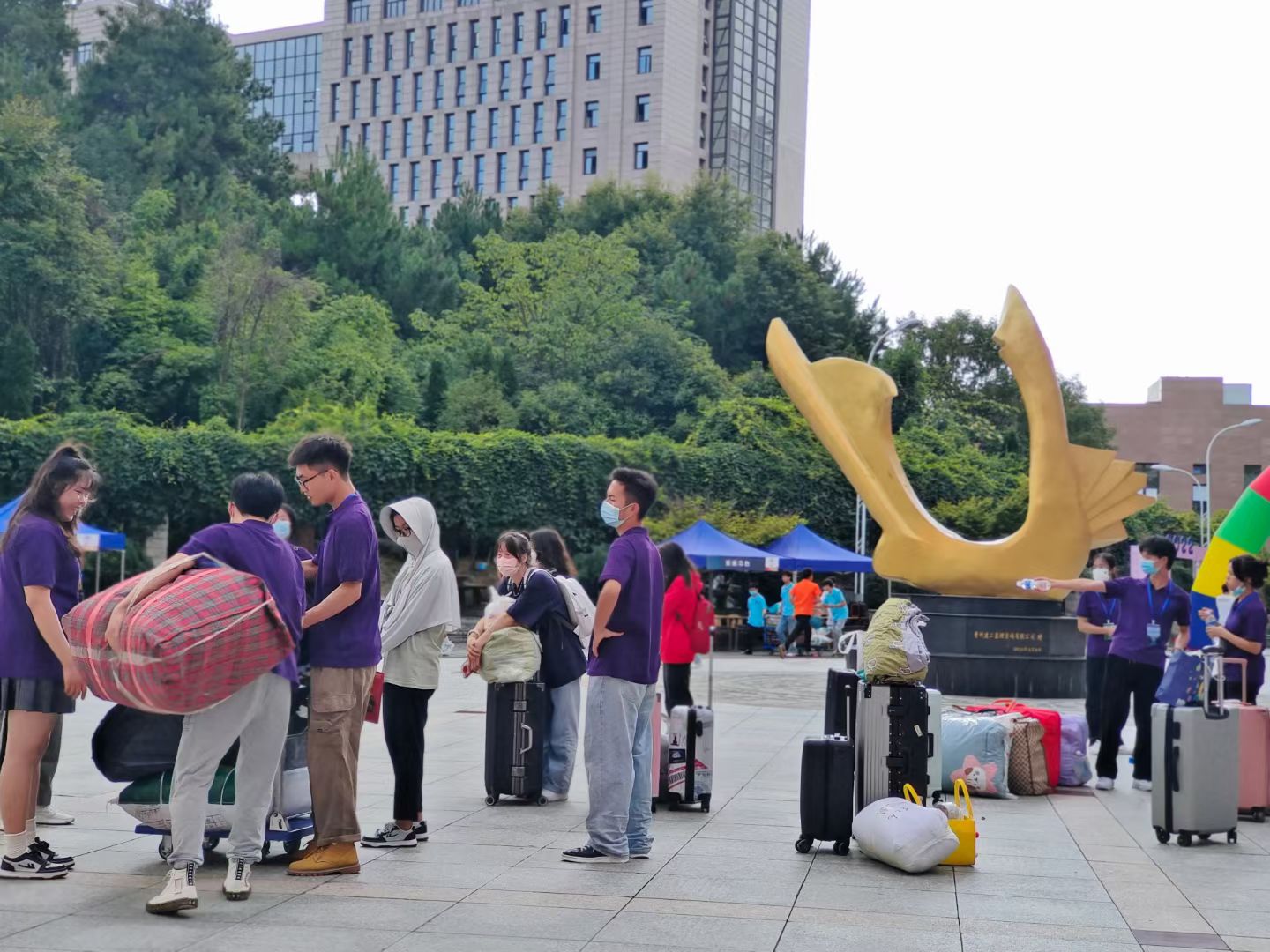为确保迎新工作的顺利进行,学院在逸夫楼演播厅门口搭棚设注册组、报道组,由各专业的班助向新生核对信息并收集材料,有序安排新生报道。我院还在校门口设询问接待处做好疫情防控的同时帮助新生熟悉报道流程与地点,并由我院学生会工作人员及院志愿者们帮助新生们搬运行李,引导新生进行扫码、报到。迎新期间,我院各领导也来到迎新工作点,对工作开展情况进行了详细了解,对院迎新工作表示充分肯定,并对新生致以亲切的问候。在工作人员以及志愿者一天的忙碌下,新生报到有序快速进行,各项工作在下午五点前圆满结束。