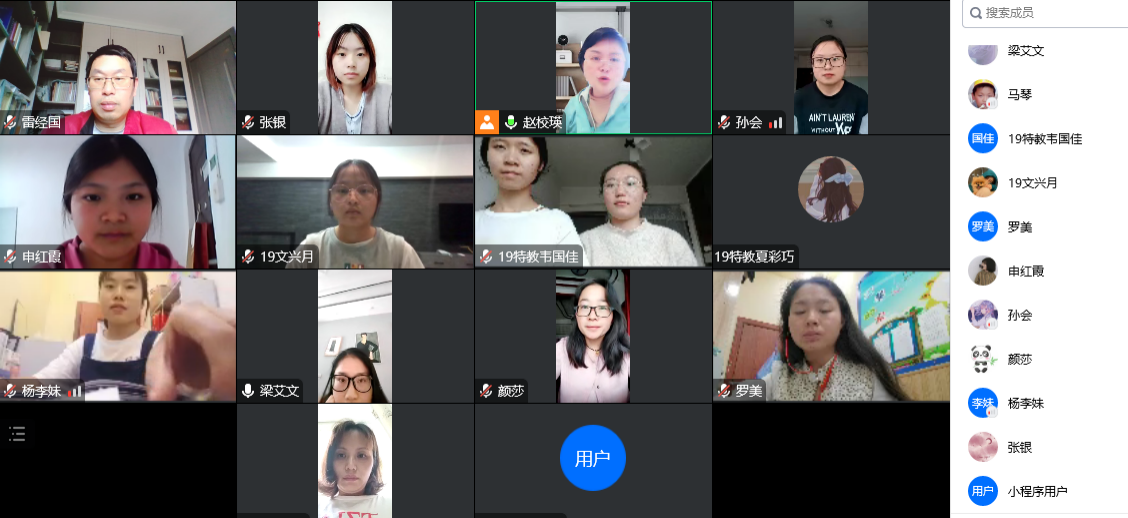 此次腾讯会议包括了两个阶段。第一阶段主要是实习生的实习教研回顾与指导。雷经国副教授首先对合作实习单位的领导和指导老师对我系的实习工作一如既往的精心指导进行了致谢;接着6位实习生对本学习期的实习情况进行的简要回顾。然后,雷老师对实习生的实习情况进行了总结和点评,并对国庆期间的放假、疫情防控工作、以及国庆后的下一步实习工作计划提出了相关指导和要求。最后,赵校瑛主任对实习老师在这疫情特殊时间中克服了生活上的困难,坚持了线上的实习工作和学习实属不易,特别感谢实习组长孙会及时把各位实习老师的情况和困难及时与惠智学校教导处交流。同时,赵主任把云岩区教育局关于国庆期间对学校教职工的各项要求进行了安排和部署。