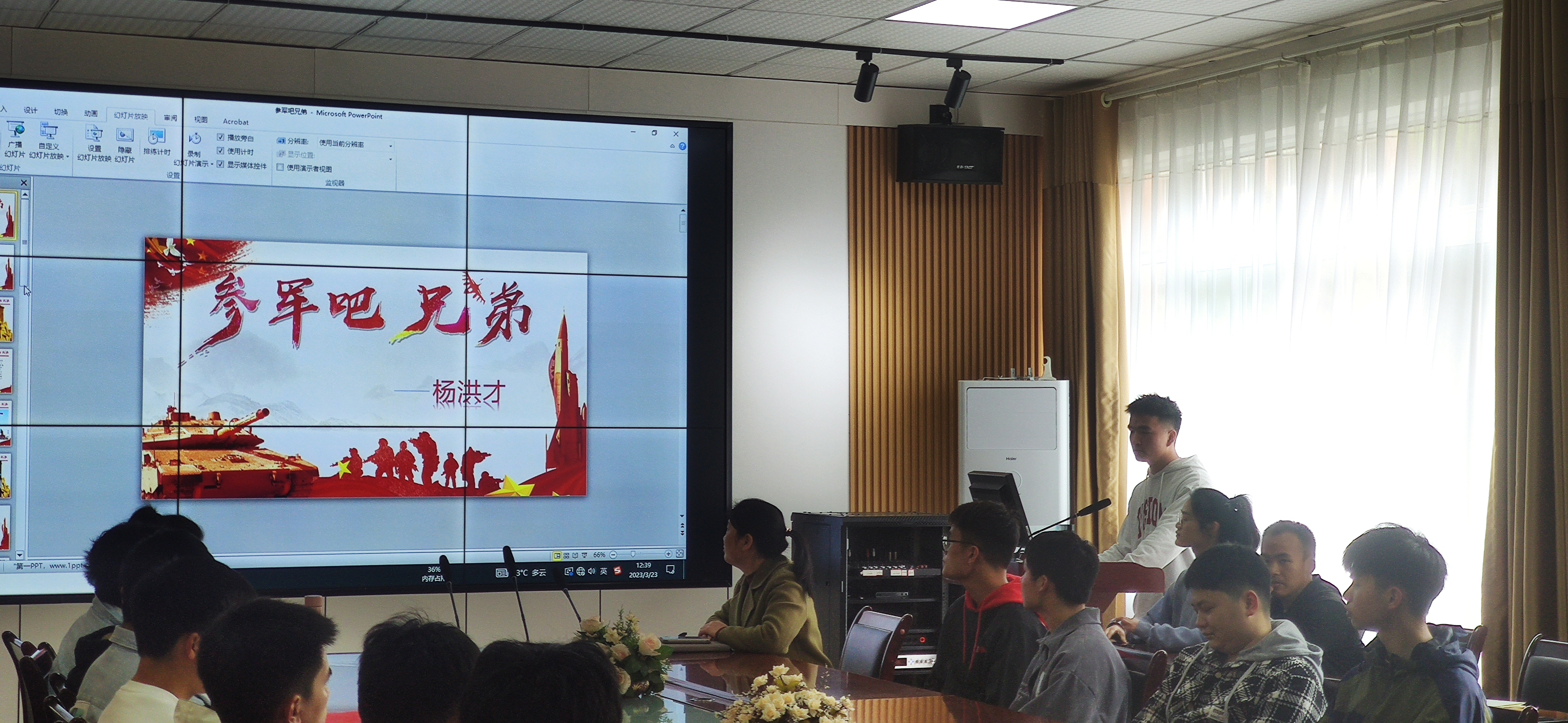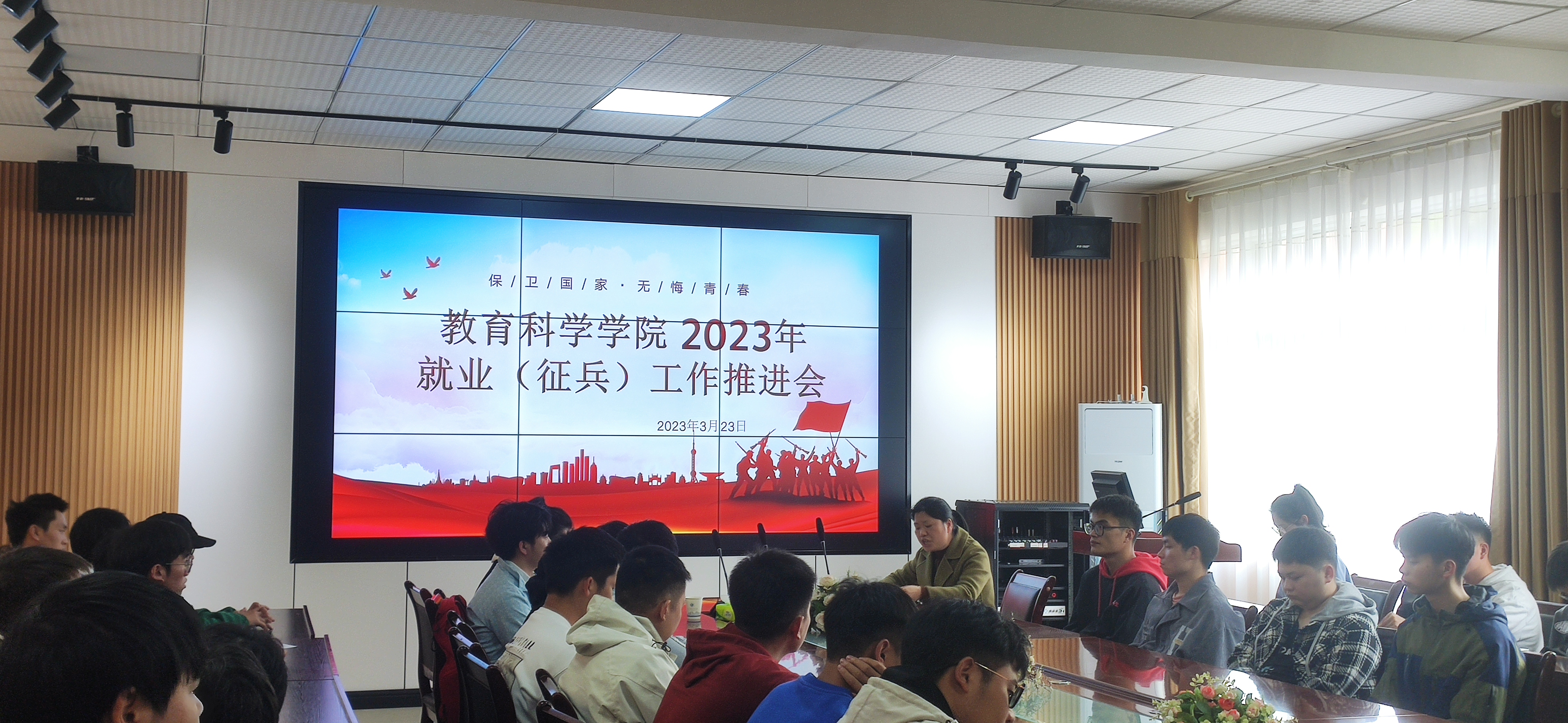 在逸夫楼321会议室召开了2023年大学生征兵动员暨就业推进会,学院党委副书记傅小芳、团委书记张源、退役大学生杨洪才和叶乐健、19级男生、20级男生共60余名学生参加了此次会议。