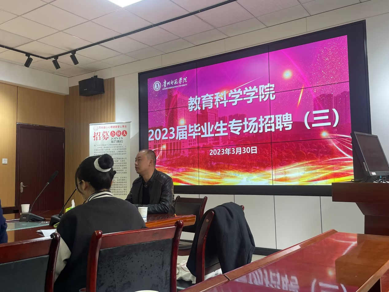 心理岗位专场招聘会在学院会议室A321教室召开。此次招聘会邀请到了黔西市众益社工中心负责人金浪到我院宣讲,会议由负责就业工作的辅导员鲁蓓蓓主持。