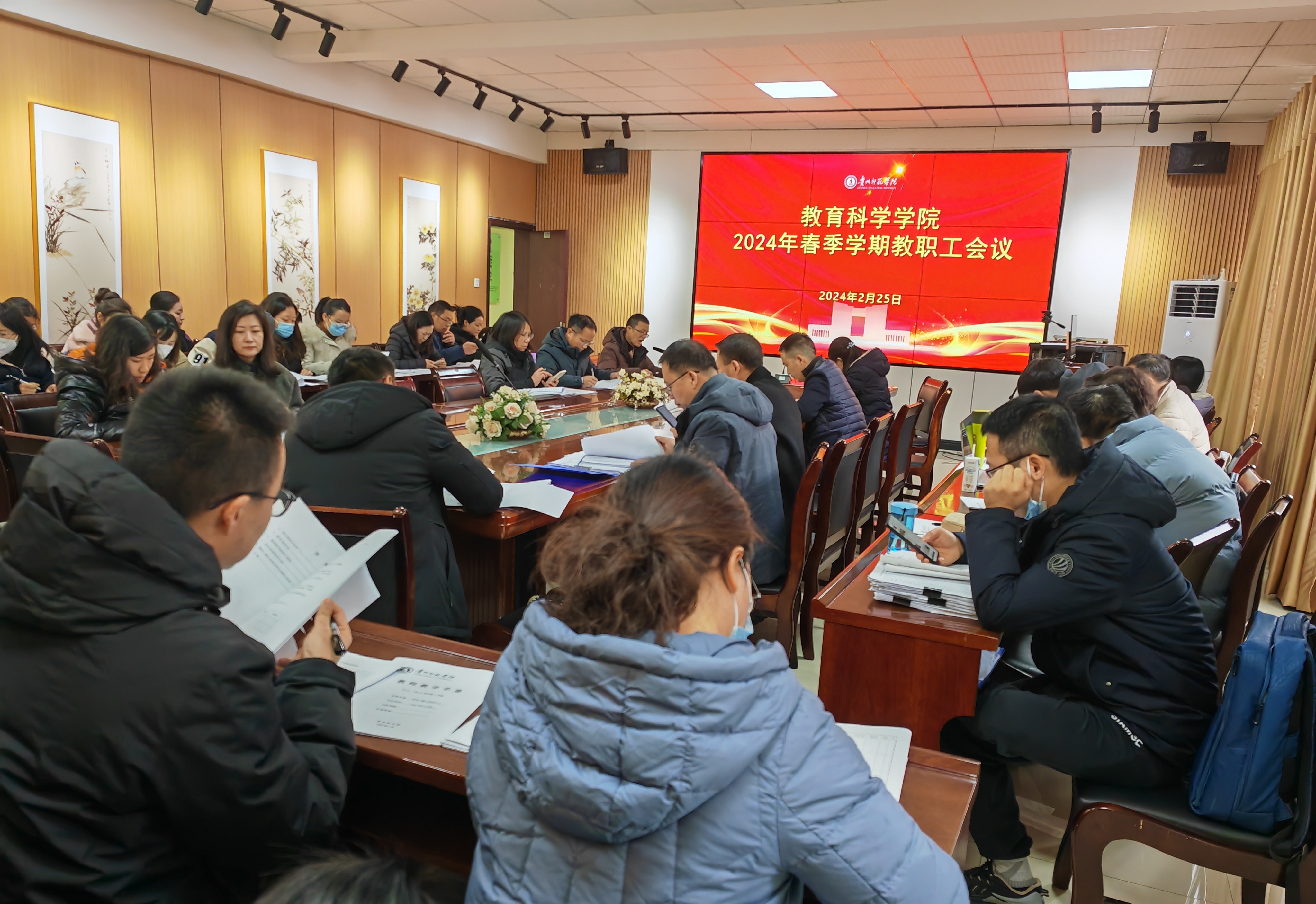 在会议室召开了2024年春季学期开会工作会,全体教职工参会,会议由学院院长宋万琚主持,学院党委书记肖湘萍作讲话。