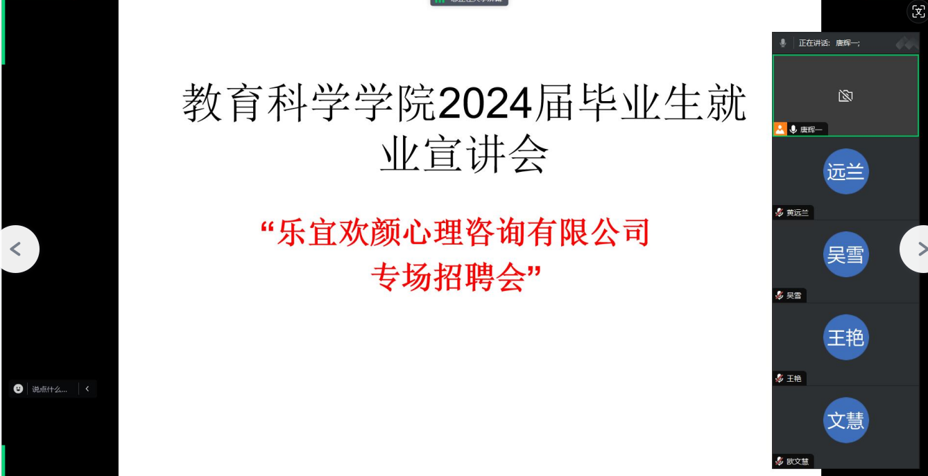 举行了应用心理学专业线上专场招聘会,应用心理学系主任倪磊、2020级应用心理学班辅导员唐辉一、2020级应用心理学毕业生共50余人参加了此次招聘会。此次招聘会由唐辉一主持。