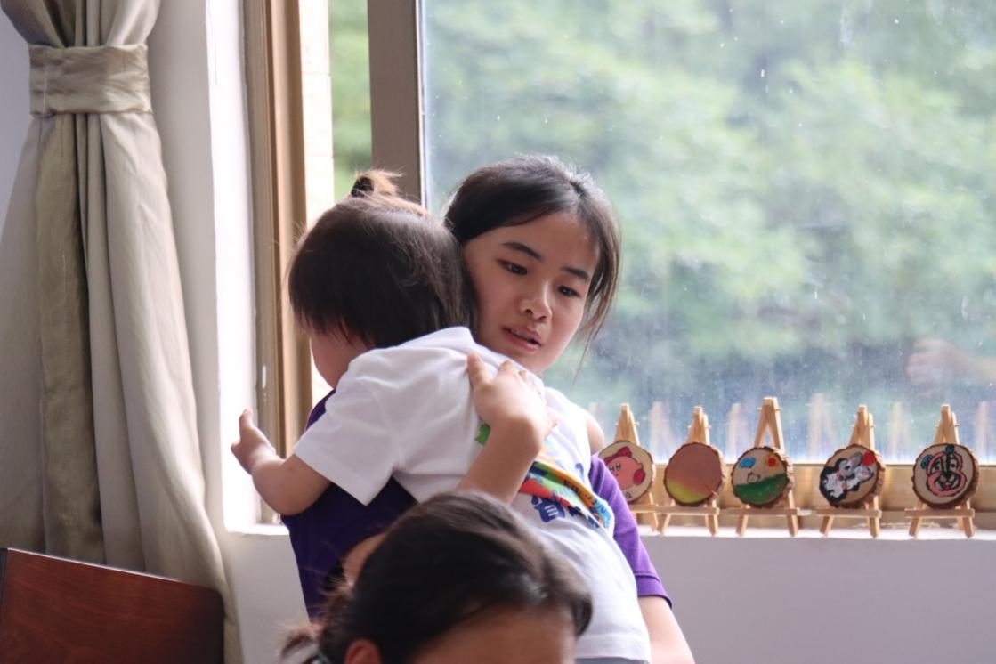 上午,志愿者们先是为每一位小朋友分发小圆木和丙烯颜料,小朋友们使用丙烯颜料进行了创作。随后,志愿者们为小朋友们准备了律动操,并带领他们一起活动。志愿者们还为孩子们教授了颜料手印画。下午,志愿者们先是带领孩子们一起跳律动操,活跃氛围,并引导着孩子们们参与穿珠和插智力棒的活动。随后带领孩子们参与穿珠和插智力棒的活动。每一颗珠子的串联、每一根智力棒的插入,都成为了孩子们探索规律的脚步。通过这些活动,展现了他们童真的一面,也迅速拉进了彼此的距离。