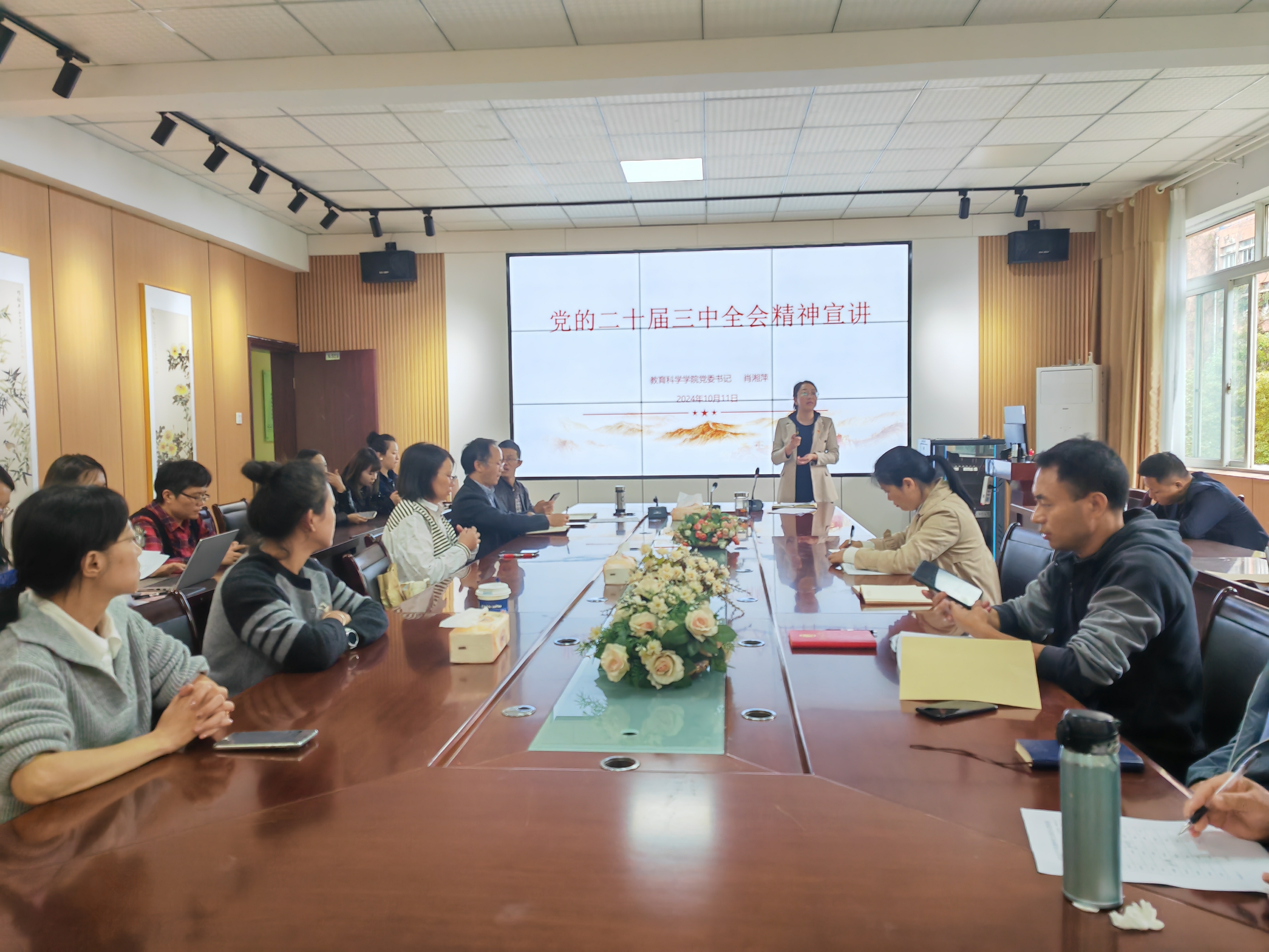 10月11日,学院党委书记肖湘萍向全院教职工宣讲了党的二十届三中全会精神,进一步提升了全体教职工对全会重大标志性、开创性意义的认识,进一步深入学习领会了习近平总书记在全会上的重要讲话精神。