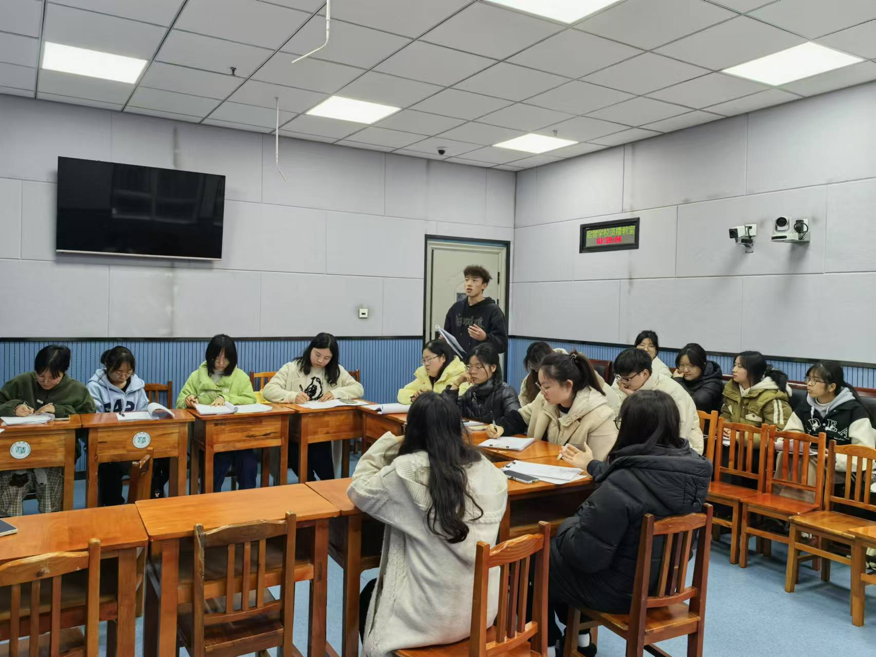 上午9:15 - 9:50,同学们开启了进班听课环节,从一年级到九年级,大家分别进入各个班级。每个班级都有相应的班主任负责,同学们在各班教室认真聆听老师们的授课,观察特殊儿童在课堂上的表现与反应。这一过程中,同学们深刻感受到了特殊教育教师在教学过程中的耐心与专业。9:50 - 10:15是大课间时间,各班老师带领学生来到教室走廊进行课间活动。同学们在一旁观察,看到老师们如何引导特殊儿童进行简单的活动,帮助他们放松身心,增强肢体协调性。10:20 - 10:55,语文教研组教研课在二楼录播教室展开,由龙熙、章仕婷老师负责。启智学校语文组成员以及见习学生一同参与。教研课上,老师们展示了针对特殊儿童的语文教学方法,通过生动有趣的方式引导学生学习语文知识,注重对学生语言表达能力的培养。紧接着11:05 - 11:40是语文教研组教研课说课评课环节,由龙熙老师主持。在这个环节中,老师们对之前的教研课进行了深入的分析和讨论,提出优点与不足,为今后的教学改进提供思路。见习同学们也在这一过程中也发表了自己的看法与疑惑同时也学习到了如何进行教学反思与评价。