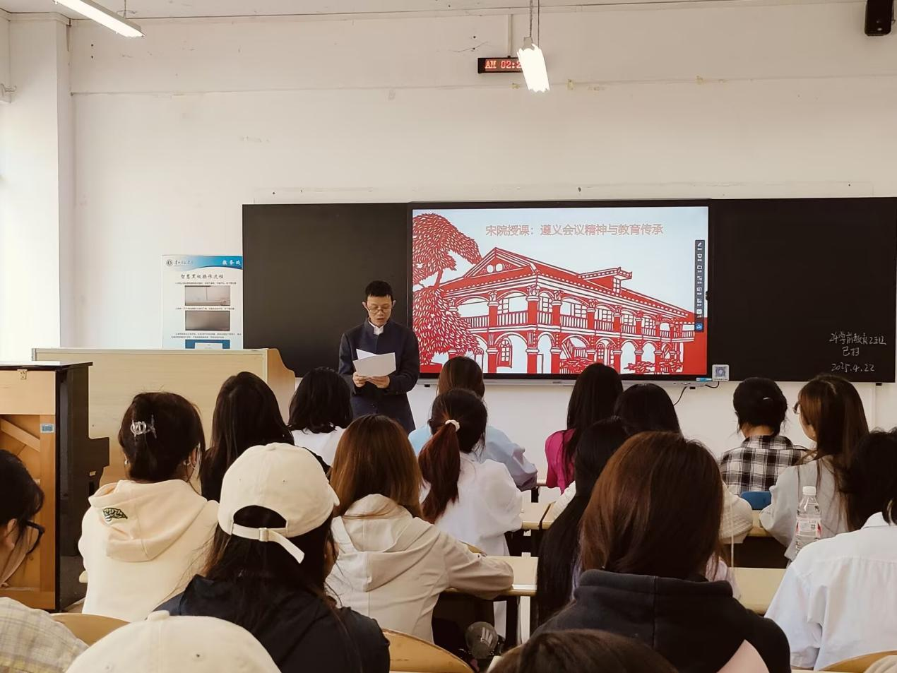 积极探索创新,将遵义会议精神深度融入青年学子思想教育。2025年4月25日,学院院长宋万琚走进2023级特殊教育班级,在逸夫楼514进行了一场别开生面的“纪念遵义会议90周年”主题班会活动。2023级特殊教育班辅导员鲁蓓蓓以及2023级特殊教育专业全体同学齐聚一堂,共同探寻红色精神与特殊教育使命的紧密联系。
