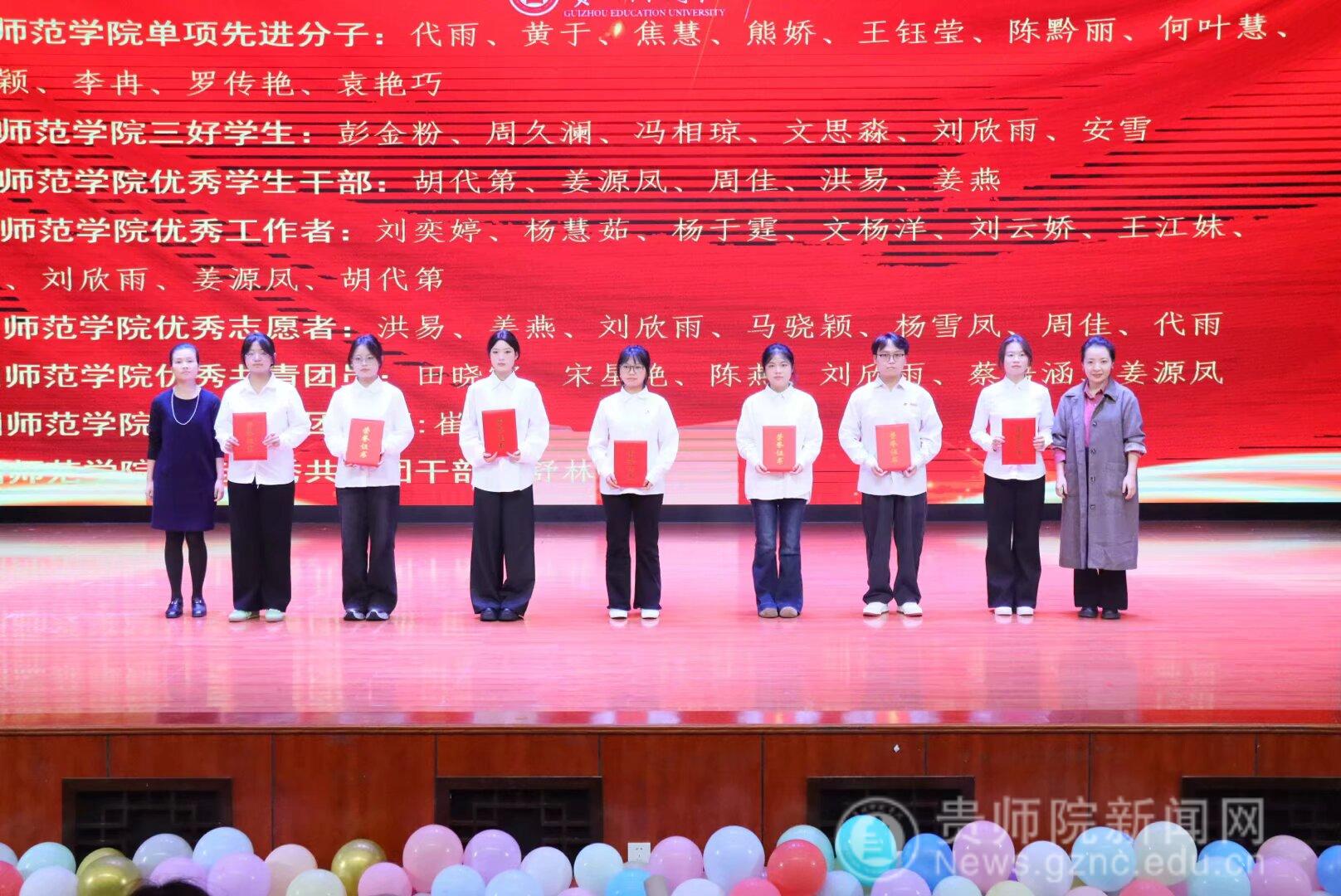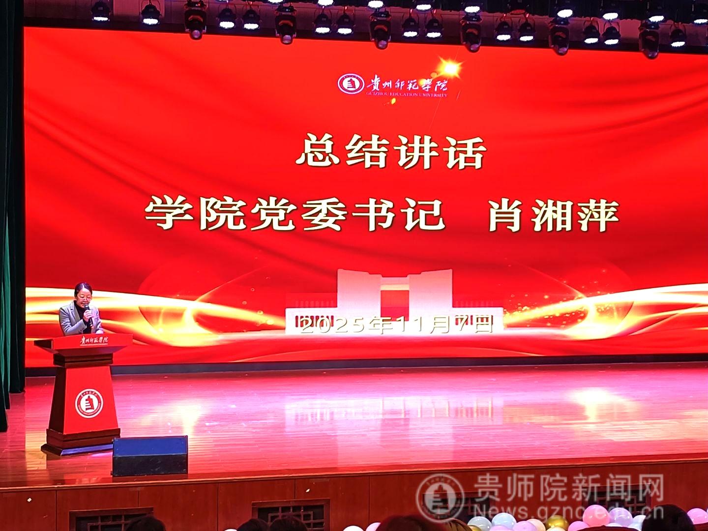 大会在庄严的氛围中拉开帷幕,傅小芳首先作年度学生工作总结报告,她从思想引领、学风建设、科技创新、社会实践等多个维度,系统回顾了一年来学院学生工作取得的成绩,肯定了教科院学子全面发展的良好风貌。在表彰环节,大会依次颁发了学业标兵类、文体类、社会实践类、文体类等多项荣誉。其中,包括国家奖学金、国家励志奖学金、三好学生、优秀学生干部等荣誉,以及在中国国际大学生创新大赛、“挑战杯”竞赛等高水平赛事中的获奖成果。在总结表彰会上,贵州省先进班级2024级学前教育一班、2025年中国国际大学生创新创业大赛铜奖项目《不沉默的蒲公英》等进行展示。最后,肖湘萍进行总结,对获奖集体和个人表示热烈祝贺,每一份荣誉都见证了同学们的辛勤付出,彰显了学院育人工作的成效,学院党委将一如既往地把学生工作摆在突出位置,全力支持同学们成长成才。