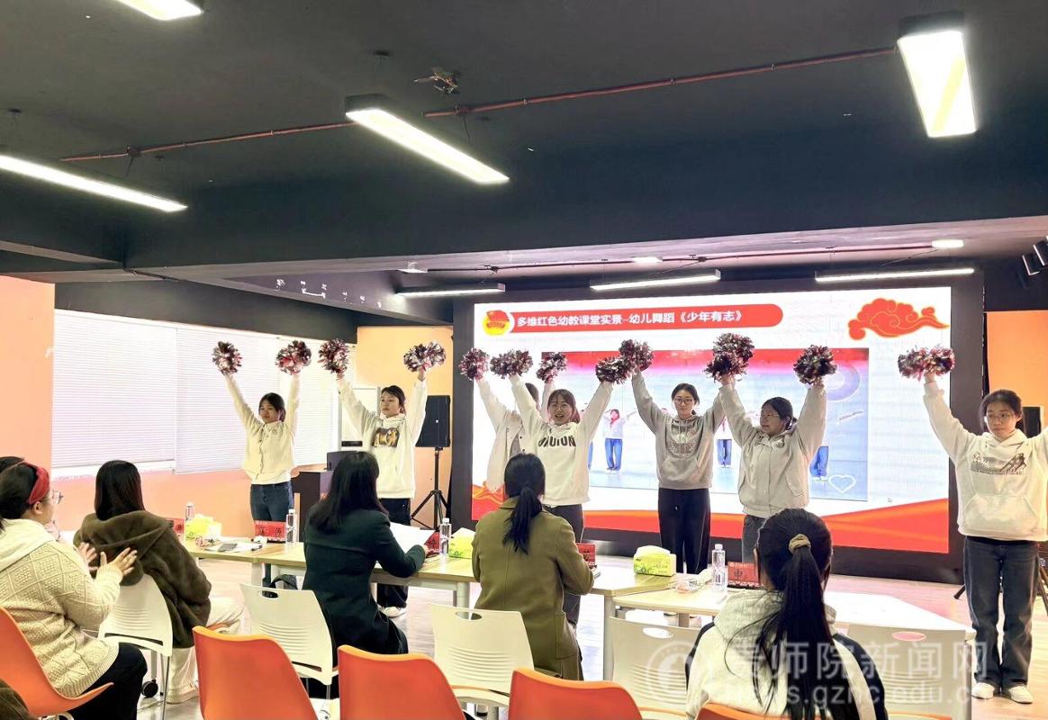 活动伊始,围绕“红色铸魂,幼教筑根”核心,支部成员通过微团课系统学习延安洛杉矶托儿所“艰苦奋斗、高度负责、深沉师爱与母爱”的精神内核,结合《幼儿园教育指导纲要(试行)》《中华人民共和国学前教育法》相关要求,以知识问答、有奖竞猜等互动形式,深化对红色幼教内涵的理解,明确学前教育传承红色文化、培育家国情怀的法律依据与教育方向。随后,活动展示了“多维红色幼教课堂实景”,幼儿舞蹈《少年有志》、手指谣《歌唱祖国》等节目片段,生动呈现了红色文化与幼儿艺术教育的融合成果;在幼教初心分享环节,支部成员介绍安慧霞园长扎根幼教33年的先进事迹,结合自身感悟畅谈青年担当,传递“青年兴则国家兴,青年强则国家强”的青春信念。再则,团支部集中展示班级成立以来的各项成果,涵盖学业、竞赛、志愿服务等多个方面,充分彰显支部成员勤学笃行、甘于奉献、勇于创新的良好风貌。