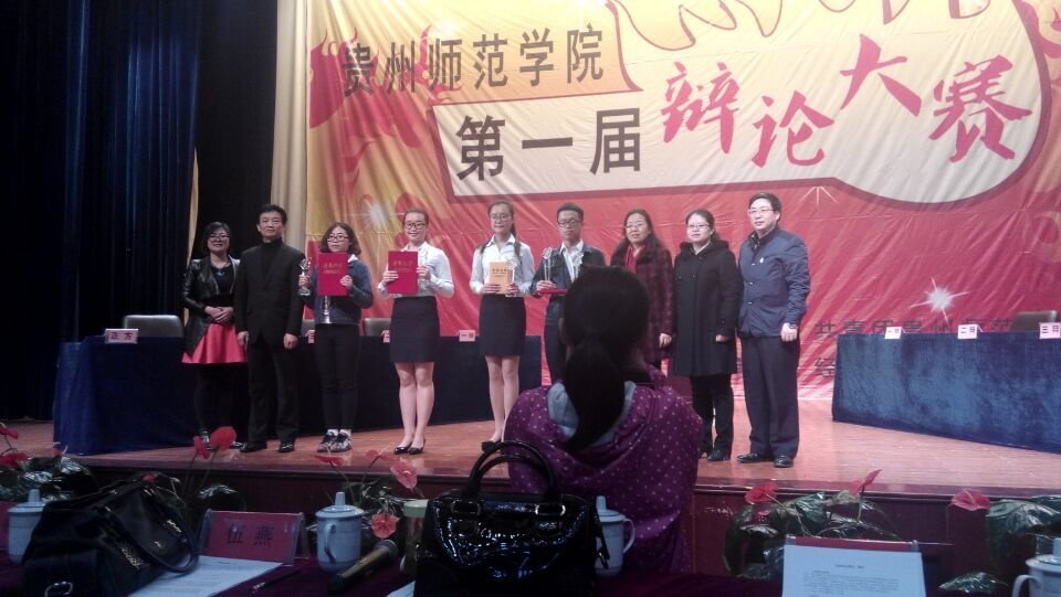 4月9日晚,在申苒老师的指导下,我院周凌宇、杜舒云、滕江文珠、冯坚四名同组队参加了在逸夫楼演播厅举行的“迎评促建,魅力师院,言辩青春”贵州师范学院第一届大学生辩论赛的决赛,并包揽了当晚所有奖项,获决赛冠军、“最佳人气辩队”,滕江文珠同学还获“最佳辩手”称号。