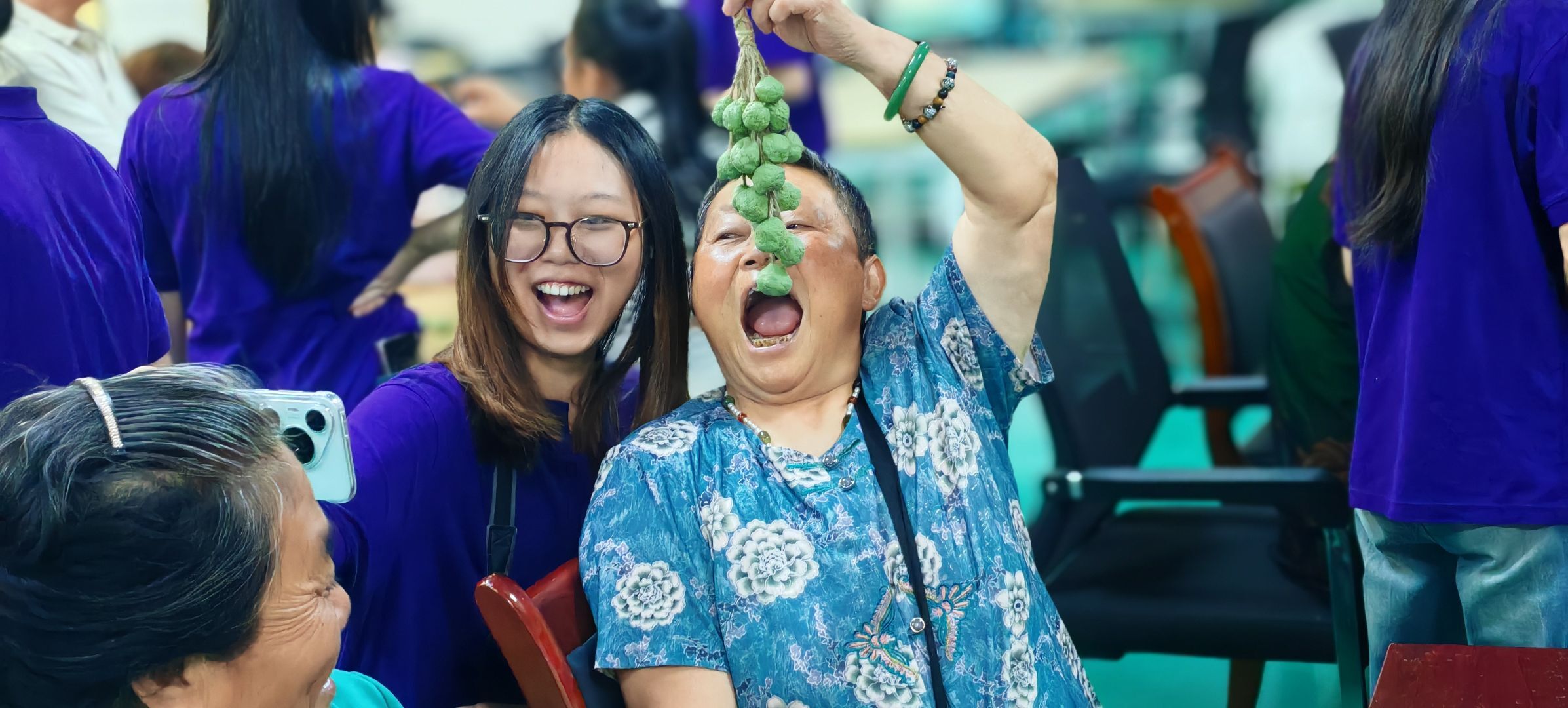 的童心绘梦志愿服务队的志愿者们与社区数位银发长者和残障人士围坐一堂,指尖翻飞间,一块块晶莹别致、散发着清甜果香的手工葡萄皂逐渐成型。
